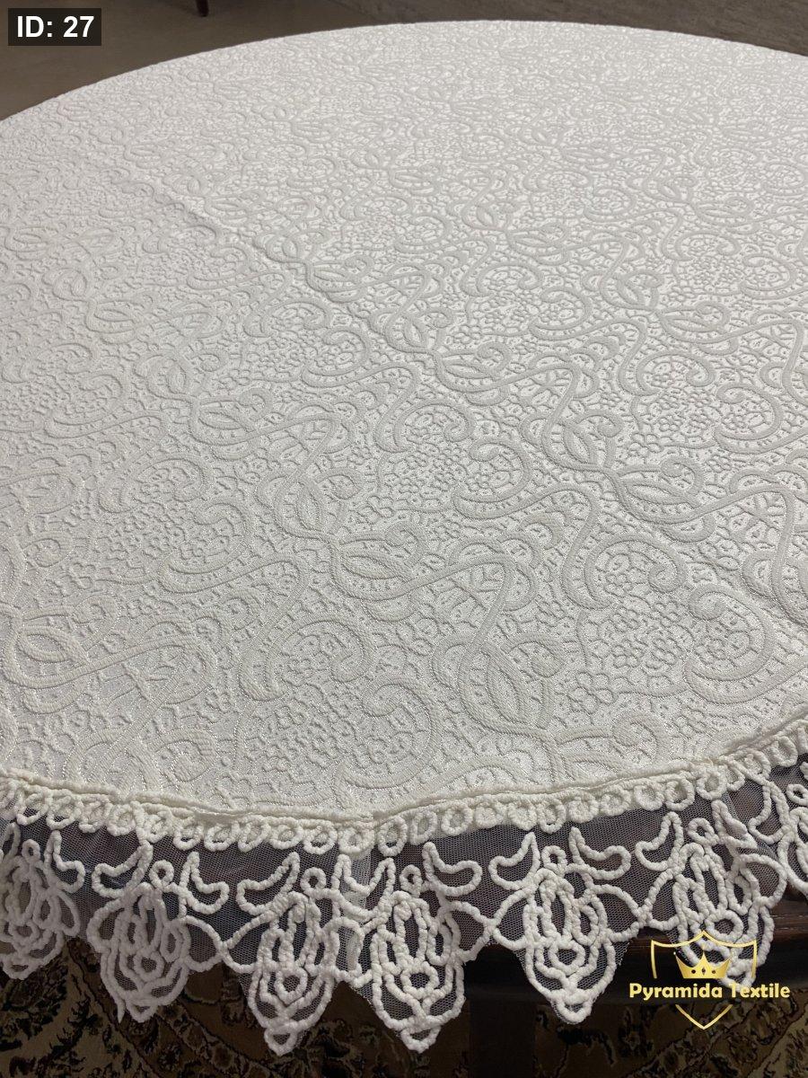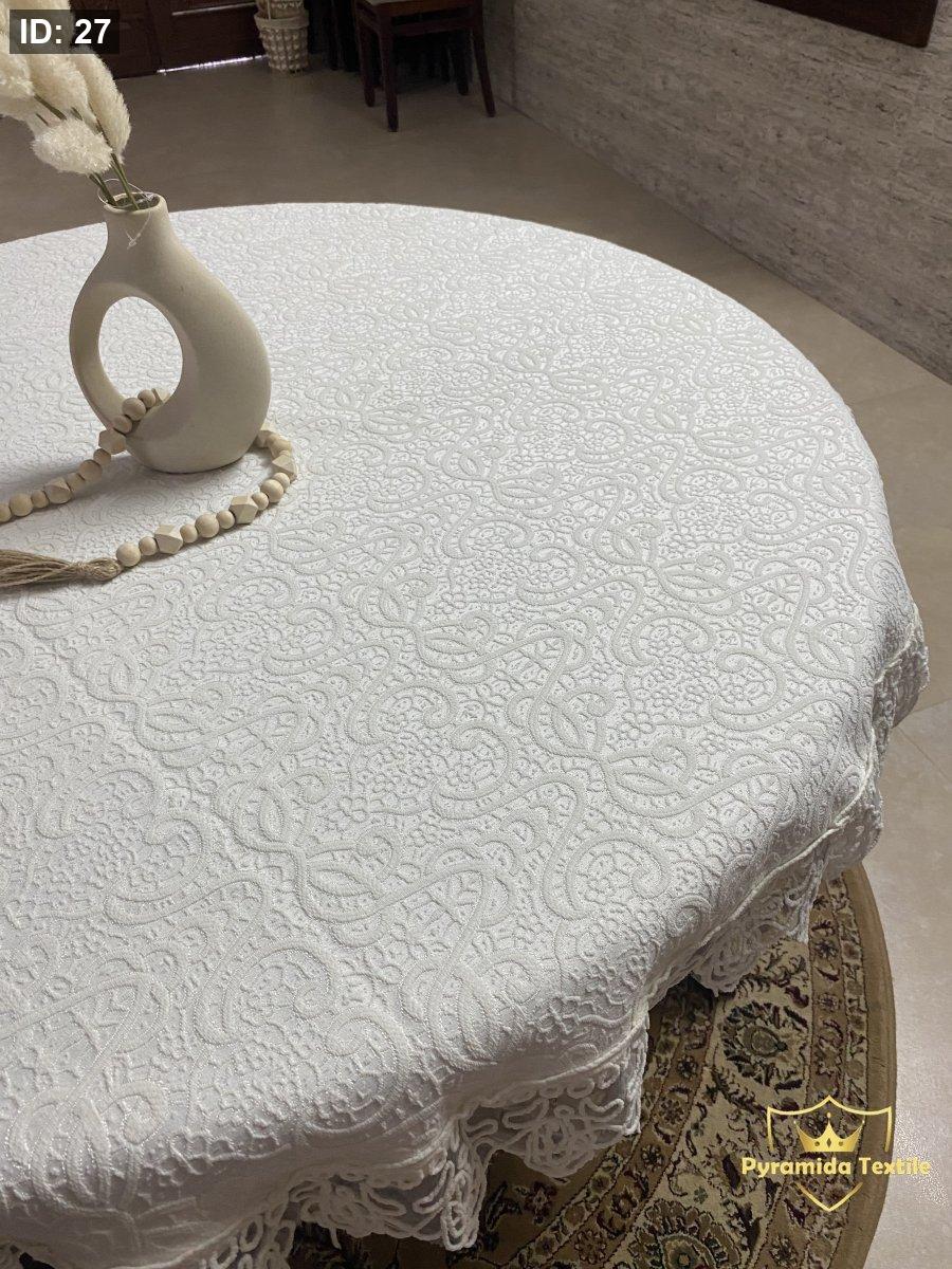 شرشف طاولة دائري ابيض مع الدانتيل الناعم بقياس 140 سم وقياس 90 سم